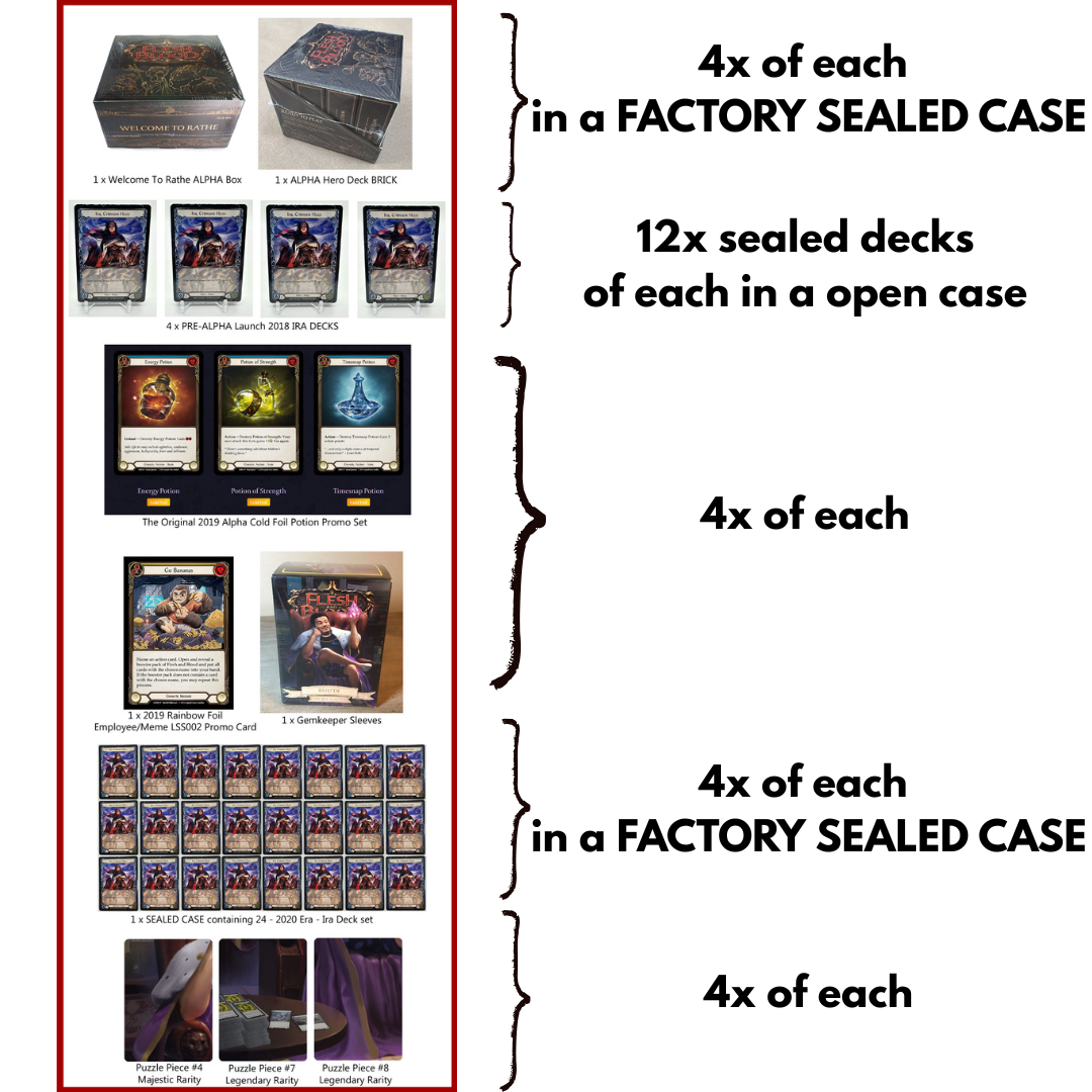 We have here a once in a lifetime collector's bundle of Alpha release Flesh and Blood Products. The combination and age of these are very difficult to come across and an epic addition to anyone's collection. Below are more information and the collection breakdown: